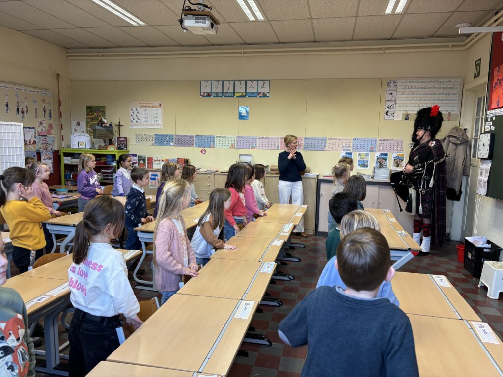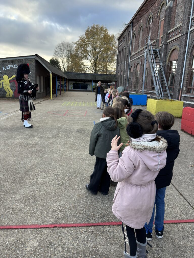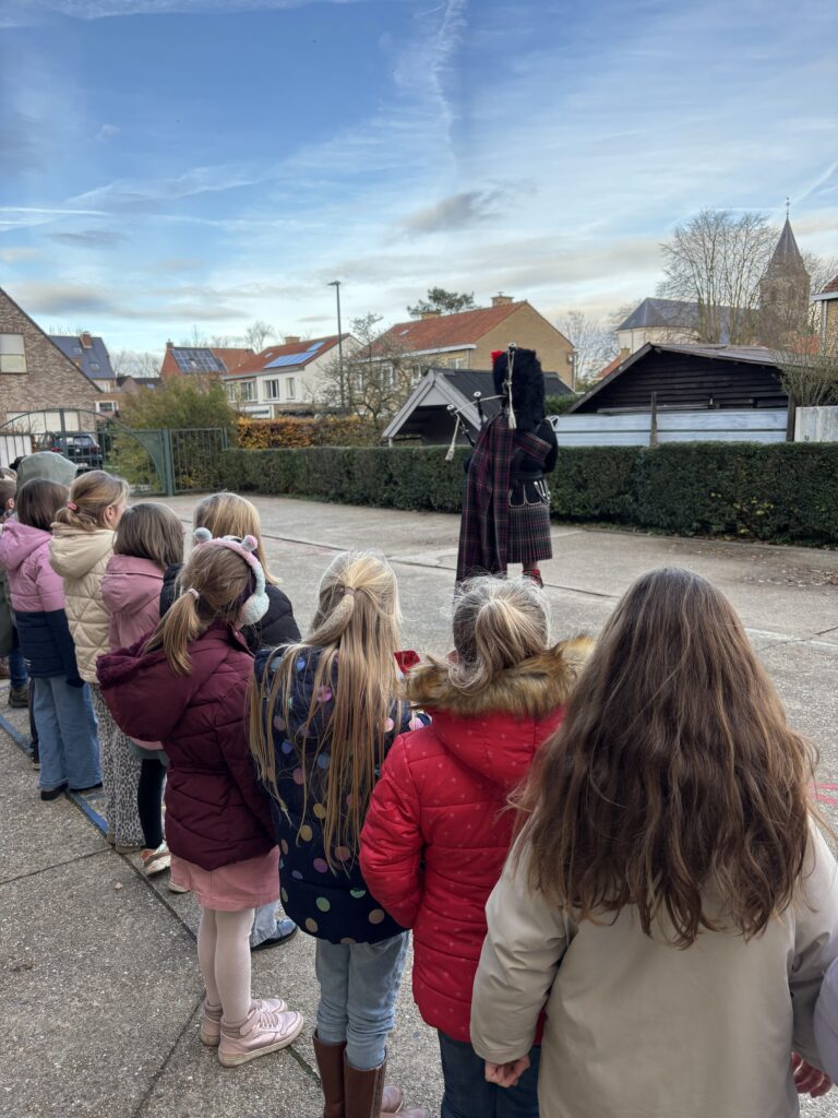 Dinsdagmiddag hadden we hoogbezoek van de papa van Roxàn. Hij liet ons kennismaken met de doedelzak. Speciaal voor ons kwam hij zelfs met de typische kledij. Iedereen luisterde aandachtig naar het indrukwekkende geluid en we mochten van dichtbij zien hoe het instrument werkte. Dit paste perfect binnen ons Wero-thema over de feesten in november, waarin we leerden hoe muziek en tradities een belangrijke rol spelen bij het herdenken van de wereldoorlog. Het was een leuke, leerrijke ervaring waar de kinderen nog lang over zullen napraten!
